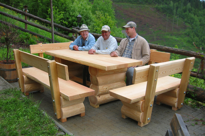 Schwere Garten-Sitzgarnitur aus massiven, witterungsbeständigen Lärchenholz. Untergestell aus übereinander liegenden Rundstämmen. Tischplatten, Sitzflächen und Lehnen aus massiven Pfosten mit geglätteten Naturkanten.